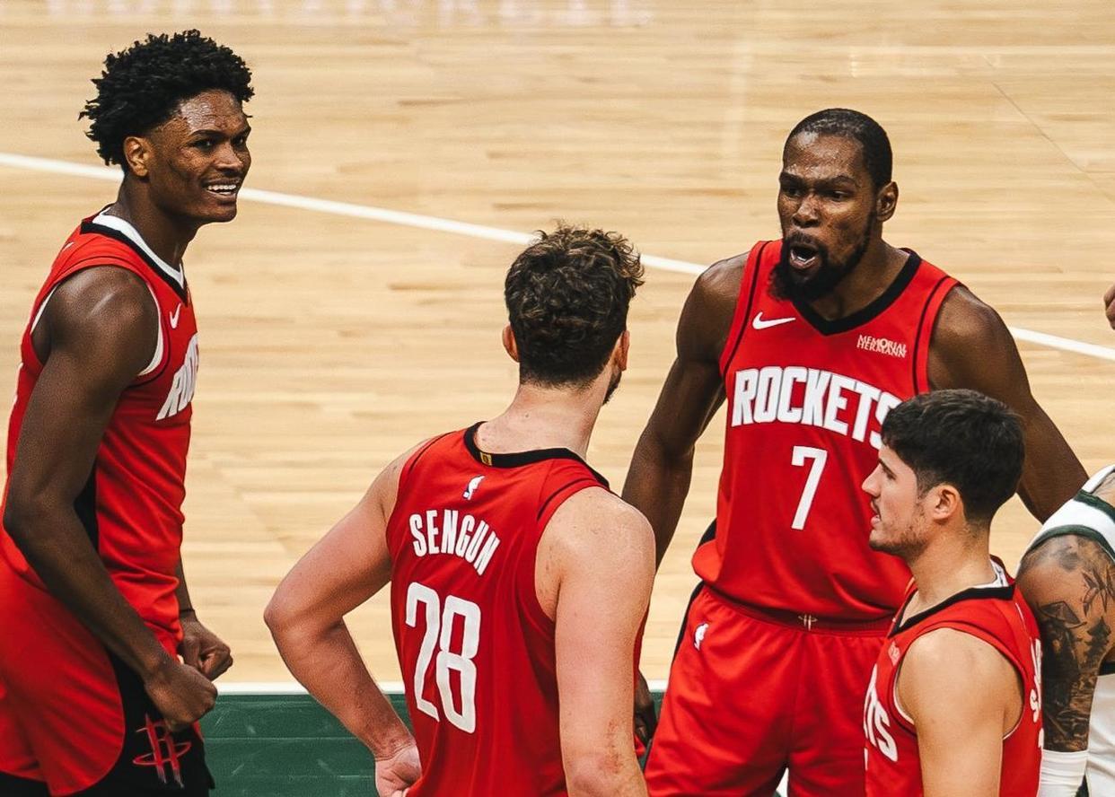 火箭队今天战胜了孟菲斯灰熊队,拿到两连胜。本场比赛火箭队赢得不容易,虽然主场作战,但是火箭队一上来打得非常被动,前两节过后,火箭队还落后对手。不过在第3节末段和第4节初段,火箭队由申京和杜兰特连续发力,最终反超了比分。而杜兰特的几记三分以及申京在内线强硬的上篮,帮助火箭队守住了胜利。