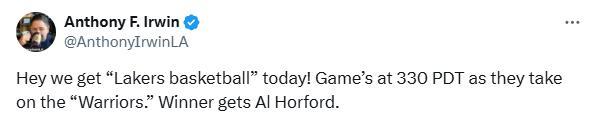 今日,湖人记者Anthony F. Irwin发推为该赛事宣传:“嘿,今天有‘湖人式篮球’看啦!比赛将在太平洋时间下午3:30开打,他们将对阵‘勇士’。胜者就能得到霍福德。”
