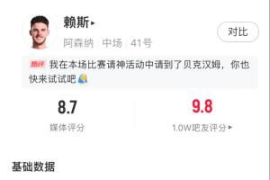 欧冠1/4决赛焦点战阿森纳vs皇马,首回合枪手主场3-0大胜,本场两队8名亿元先生全部先发,身价1.1亿欧的赖斯任意球双响,打出生涯代表作。